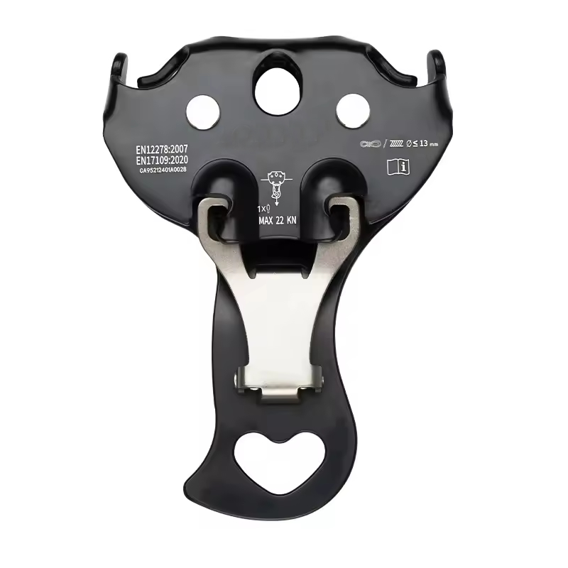 冒险探险公园用专用溜索双滑轮,独特闭合结构直排双滑轮,滑轮与连接器一体式设计,受力时能安全的锁住锁门。可快速连接绳索及钢缆。侧板铝合金结构主体,高效不锈钢滚珠轴承,用于在钢索、绳索横渡。材质:7075铝合金;尺寸:长165mm,宽145mm;速度:15m/s,使用绳索直径:Ø13mm,钢缆直径:Ø12mm。重量:407g,断裂负荷25KN,工作负荷6KN;认证标准:CE EN 12278
