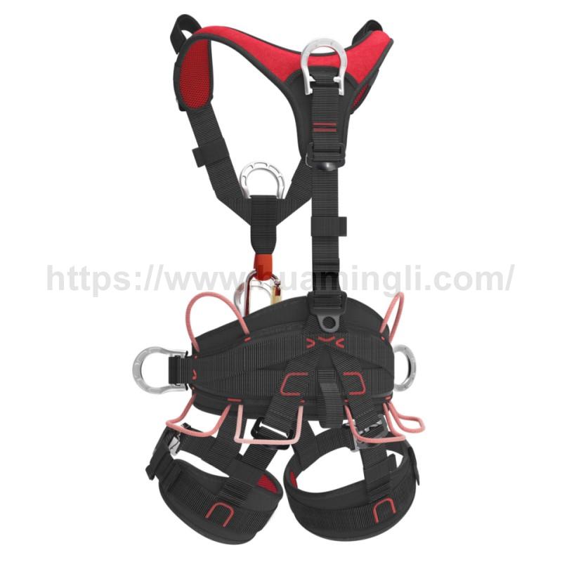 前、后双防坠落连接点;腰部可折叠D环用于工作定位;6个硬挺装备环最低承重15kg;腰垫、肩垫、腿垫均采用蜂窝式EVA,保持良好透气性;腹部D环两侧配有坐板连接环;腿部使用二段式快速连接扣,方便穿戴;分散式腰部支撑,保持长时间舒适;配有胸式上升器。