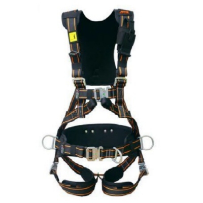 全身式速穿安全带,6处可调节尺寸大小;五挂点设计,用于防坠限位功能;坚固而轻质的Y型背部转向板,可方便的调节大D型环的位置;保持距离,提供使用者舒适穿着;背部加装304不锈钢板永不磨损,腰部加装可拆卸Pa6护板,后期可自行更换。插扣为合金钢材质。